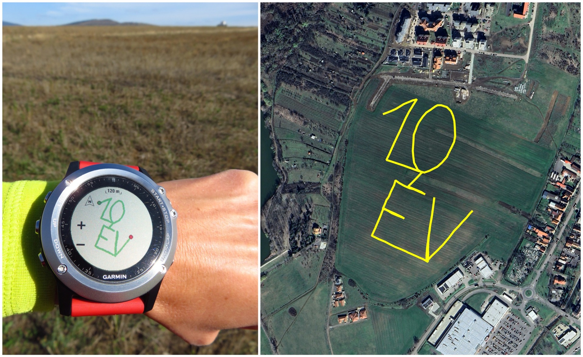 Futás közben képekkel dokumentáltam, hogyan "rajzolok" GPS figurákat a szántóföldön. Ez esetben a Batman logónál, bambusznádra kötött törölközőcsíkok segítettek a sarokpontoknál. De ha menet közben túl hamar figyeltem a jelzésre, sokszor inkább elvezetett, mert olyankor valamiért egyenes vonalban akartam futni a zászló irányába. Csak a logó járt a fejemben... Egy mezőn sokkal nehezebb irányba maradni, mint a város utcáin. Viszont itt nincsenek korlátok és semmi sem lehetetlen!